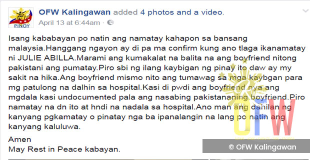 OFW Found Dead In A Hotel Room In Malaysia,Pakistani Boyfriend reported the incident Overseas Filipino Worker found dead inside her hotel room. She was working as a caregiver in Malaysia.