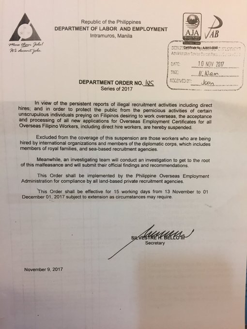 "We are taking this important action in a view of the persistent reports of illegal recruitment activities including direct hires, and in order to protect the public from the pernicious activities of certain unscrupulous individuals preying on the OFWs," Bello said in a statement.